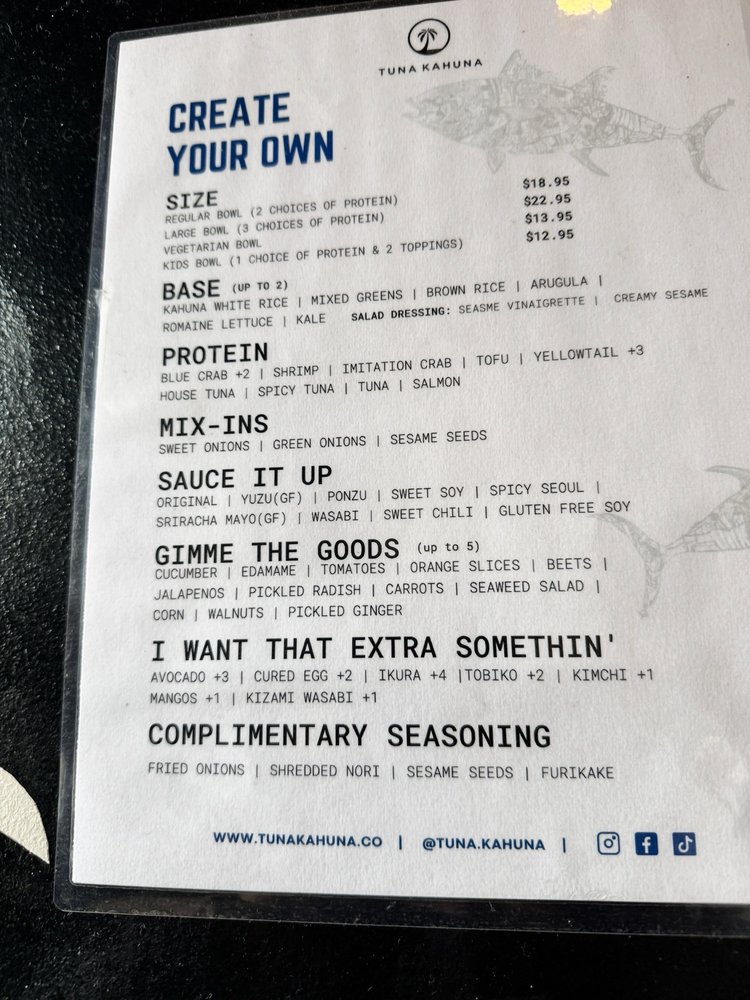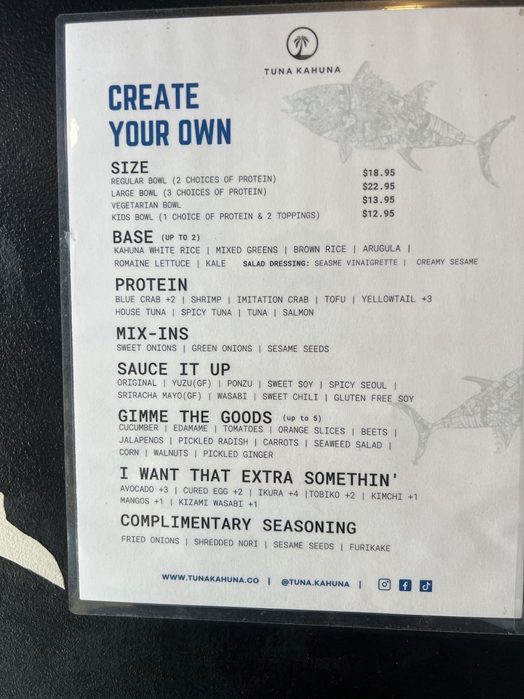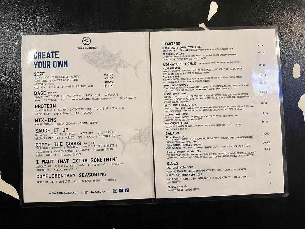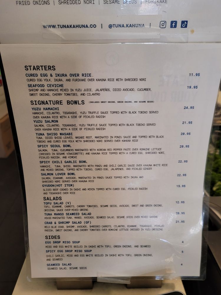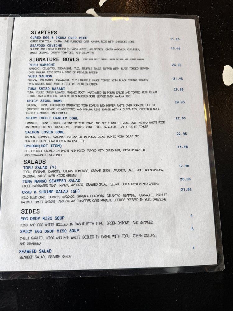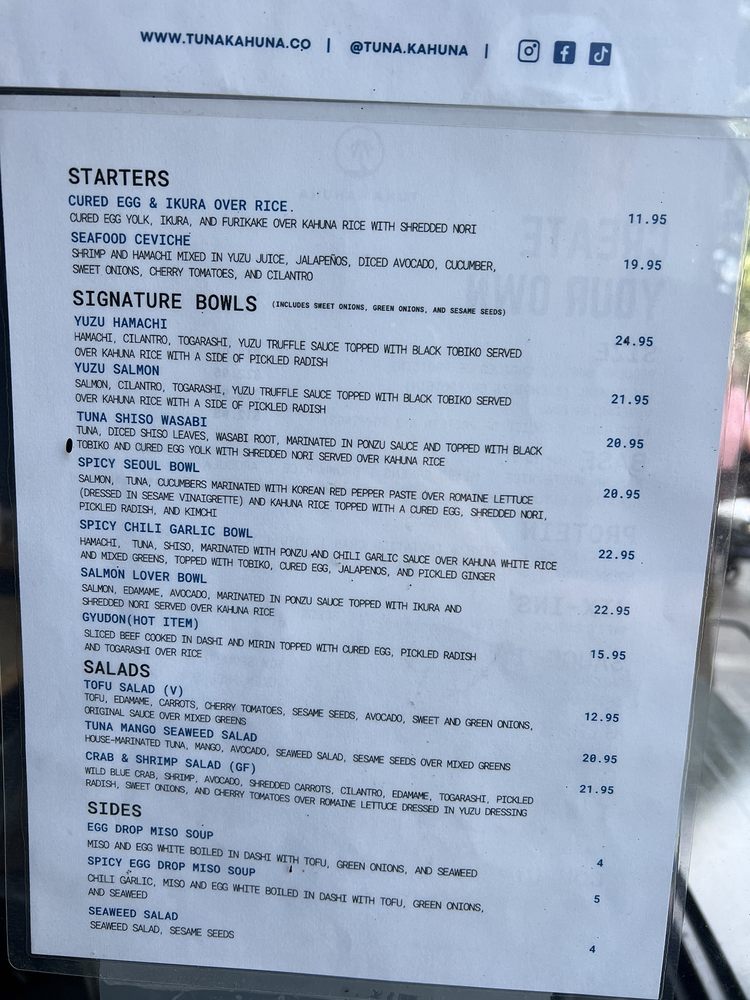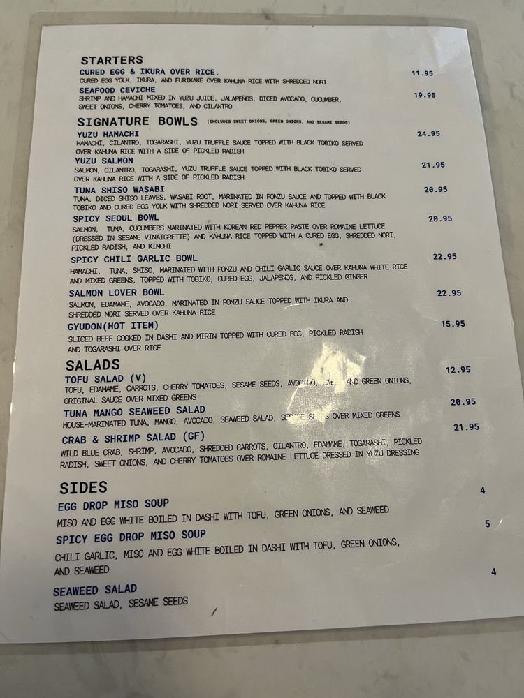 Hamachi and tuna, sesame seeds, sweet and green onions, shiso, marinated with ponzu and chili garlic sauce over Kahuna rice and mixed greens, topped with tobiko, cured egg, jalapenos and pickled ginger